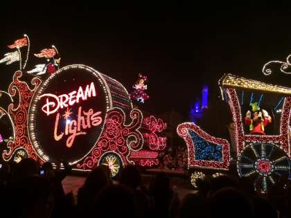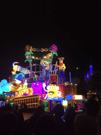 パレードが終わりました。光と音楽に包まれて,ディズニーのスターたちが輝く,夢いっぱいのナイトパレード。色とりどりのフロートがファンタジックにパークの夜を彩りました。集合時刻まで1時間を切りました。
