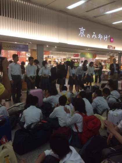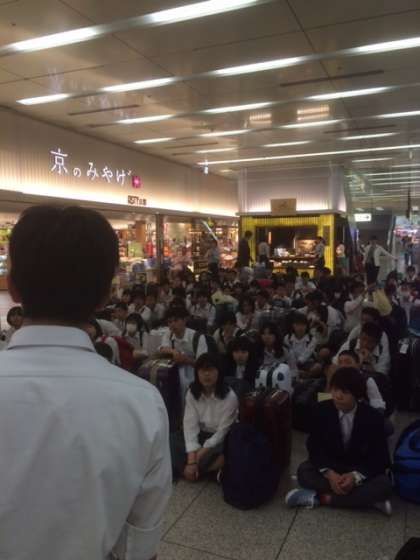 京都駅に到着した生徒たちは,解団式を行いました。バスで高野中校区に戻ります。バスは,17:00に京都駅を出発しました。校区内のバス下車ルートは,出町柳→百万遍→里ノ前→大久保町→高野→赤の宮→馬橋の順です。