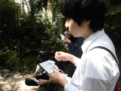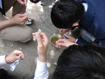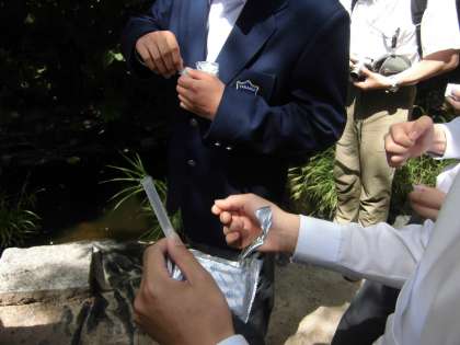 ビオトープでは,水質調査をしました。まず,水温を測るところから始めました。19度でした。次は,パックテストです。COD担当,PO4担当,NO2担当,NO3担当に分かれました。