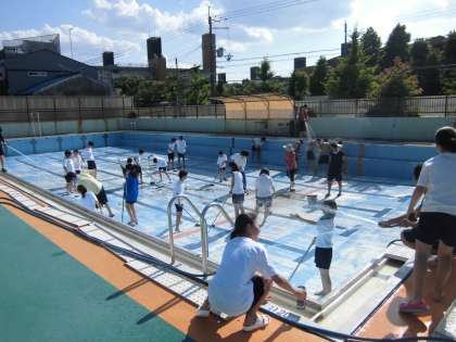現在,プール掃除が行われています。昨日から水を抜いていました。授業で使えるように,水を入れます。