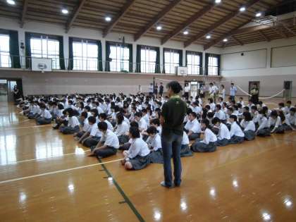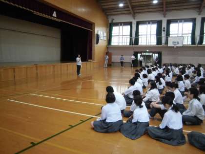 6時間目終了後,避難訓練が行われました。目的は,避難経路の確認と自分を守るための知識と冷静沈着な行動を身につけ,安全に避難できるようにすることです。写真は,体育館に避難した後,担当者の話を聞いている生徒の様子です。