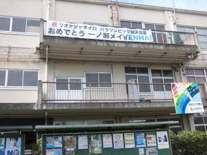 高野中卒業生の一ノ瀬メイさんがリオ・パラリンピックに競泳競技で出場することが決定しています。1日(金)に,南校舎3階のベランダに横断幕が掲げられました。この横断幕は,当時の同級生の保護者の方たちが,一ノ瀬さんの健闘を祈りつくられたものです。
