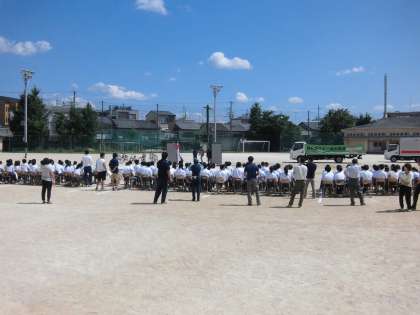 6時間目に,3学年の生徒,校区の小学校6年生,保護者,地域の交通安全でお世話になっている方を対象にスケアード・ストレイト方式の交通安全教室が行われました。スタントのプロの方が,交通事故をリアルに再現し,恐怖や衝撃を参加者に直接感じてもらうことにより,事故防止の意識を高めてもらうというものです。京都市と京都府警の連携により行われています。