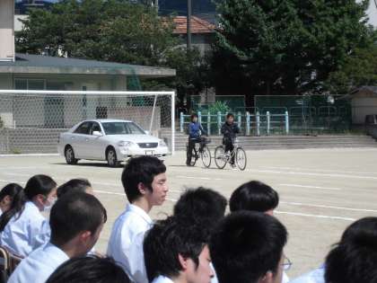 傘をさしての自転車の運転がどれほど危険か,片手でブレーキをかけた場合と両手でブレーキをかけた場合の制動距離の違いはどのくらいか,イヤホンをつけたまま後ろに迫る車を認識できるのか,スマホ運転の危険さ,車やトラックの死角を知ること,内輪差のこと,などを見たり実際に体験することで,児童・生徒たちは少しずつ予測しながら自転車に乗ることができるようになるのではないかと思います。