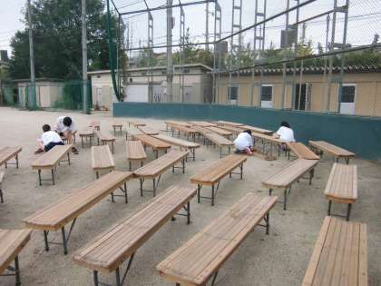 昨日,17:26に京都市域に発表された大雨警報が,本日9:36に解除されました。生徒と職員が一丸となって,体育祭の準備が進んでいます。お昼に,グランドの水を取り,整備をし,現在,ラインを引き,テントを立て,机椅子を運び,各種表示をするなど,生徒たちも全力で頑張っています。