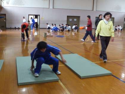 午後から,1組の生徒は,15日に行われる合同運動会の練習のため,近隣の中学校へ出かけました。5校の約20人が集まりました。そこでは徒競走やレクリエーション競技の練習が行われました。写真は,全力で練習に取り組む生徒の様子です。