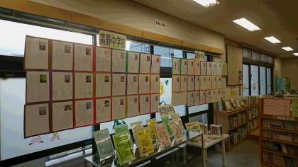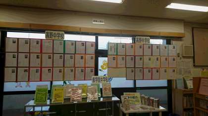 現在,左京図書館では,高野中の2年生の作品が展示されています。夏休みの課題として作成されてもので,本の紹介がしてあります。ぜひお近くにお出かけの際には,ご覧ください。
