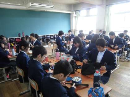 今日から6時間授業です。新入生は,午前中,学級写真撮影,校内案内などがありました。そして,新入生は,初めて昼食を食べました。お隣や前後の友達と机を合わせて昼食スタートです。少しずつ新しいクラスに慣れてきたようです。