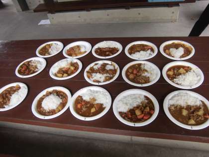 完成しました。15グループのカレーをご覧ください。どれもおいしそうです。厳正な審査の結果,味,見た目,ご飯の炊き具合,盛り付け,後片付けの総合点で4組2班のカレーが最優秀賞を獲得し,今日の1時間目の総合的な学習の時間に表彰されました。