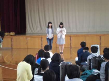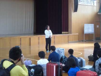 体育館で結団式が行われています。持ち物確認の後,修学旅行委員の司会で式が始まりました。委員長からは,「心に残る旅行にしましょう。そのためにも,決められたルールをしっかり守りましょう。」という呼びかけがありました。