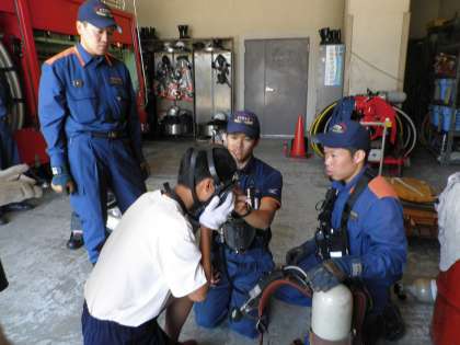 2年生のチャレンジ体験は今日が最終日です。消防署でお世話になっている生徒は,放水訓練を体験しました。防火服,マスクを身に着けてみました。