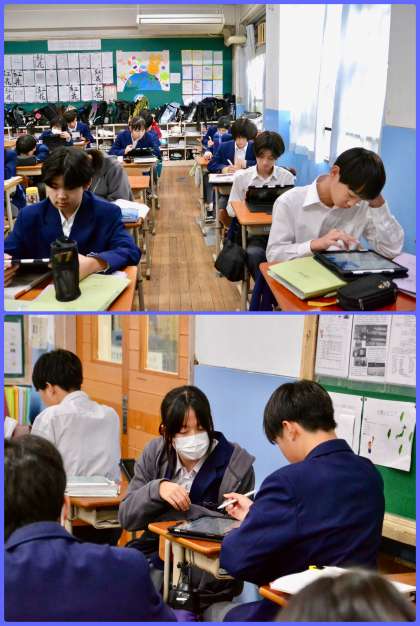 1年生は教室での授業ではなかったので、2年生の校舎に向かいました。2-2は理科、2-3は社会の授業が行われていました。2-2は個人でのテスト勉強でしたので、少し覗いてみました。3年生に負けないくらいテストモードになっているように思います。2年生も頑張ってね!