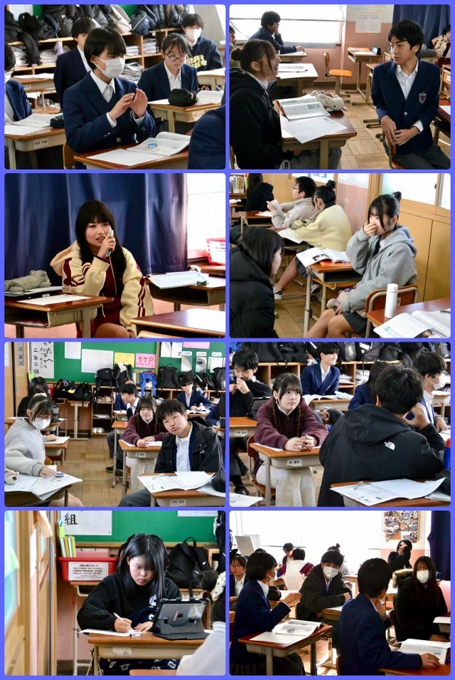 3年生にとっては今日が学年末テストの最終日。2教科のテストを終え、3時間目は道徳の授業が行われていました。2組は「より良い生き方を考える」を大きなテーマとし、バドミントンの桃田選手の考え方を扱う「自分を変える力」という教材を用いて考え、議論がされていました。3組は「自分の好きなことか安定した仕事かで悩んでいる」といった内容の教材を用い、自分ならどちらを選択するかを中心に考え、議論をしていました。4組は「友情」「信頼」について考え、「信頼ある友情」の要素を他者と突き合わせていました。どれも今後出くわすであろう葛藤が取り扱われ、生徒の皆さんも真剣に考えられていたと思います。私もこれまでの自分の生き方について考えさせられると共に、これからの自分にも関係あることだと考えなおし、3年生と同様に、担当の先生の問いに悩みながら考えていました。