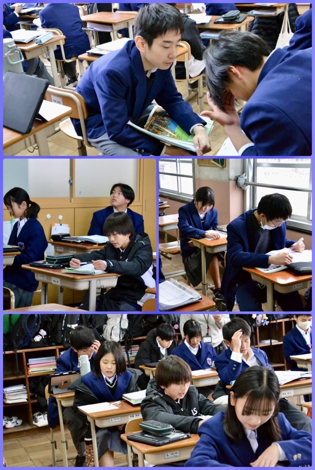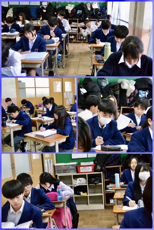 1-2は英語、1-3は数学の時間です。英語は動詞の過去形を何度も口に出し練習をしていました。数学は平面の図形を回転させてできる立体の体積について学習がされていました。今日の寒さに、ヒーターも頑張って仕事をしてはいるものの、やはり教室は肌寒く感じました。しかし、みんなそんなそぶりも見せず、しっかり学習に取り組んでいましたね。すばらしい!