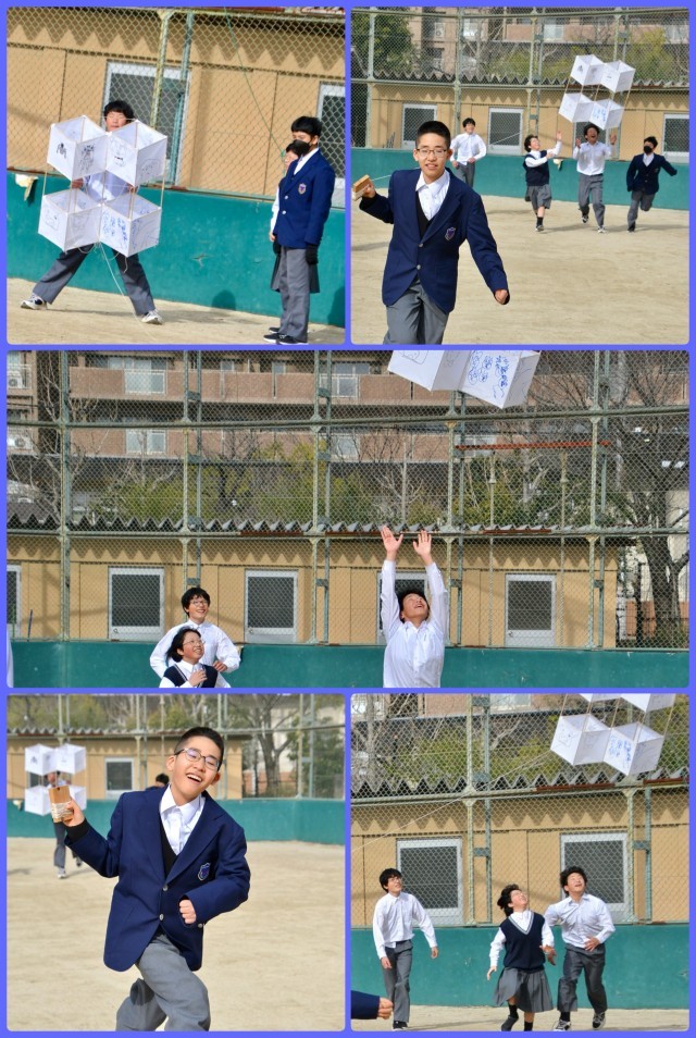 12月ごろに平面の凧を作成した後、立体の凧作りを進めていた1組の生徒たち。平面のそれは個々が作成していましたが、今回はみんなで力を合わせて一つの凧を完成させたようです。糸をもって全力で走る人、凧をもって走り、スピードが乗ってきた時点で上に投げ上げる人、役割を交代しながら試していました。上がっていたようには見えましたが、作成者の自己採点はどんなものなのでしょうか。もっと高く、もっと長く飛ぶように改善を加えるのか、一定満足のいく状態だったのか。どのような判断したのか、また教えてください。