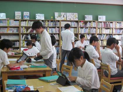 本日3限の3年生の英語の時間は,図書室においてiPadを使用して日本の文化を調べ学習しながら発表する授業でした。