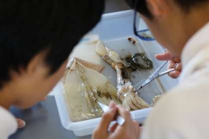 本日は,2年生理科の授業で無セキツイ動物の体のつくりや分類を学習する目的で,イカの観察・解剖の実験をしました。