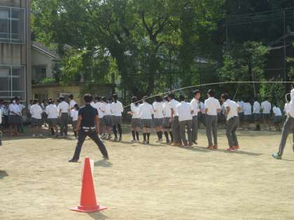各チームそれぞれ,作戦を練って跳ぼうとしていましたね。体育科の先生方は『縄を大きく回したら跳べるよ』とアドバイスをされていました。回す生徒は大きく弧を描くように,跳ぶ生徒はより高く跳ぼうと短時間にチャレンジしていたのが印象的でした。