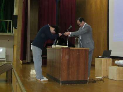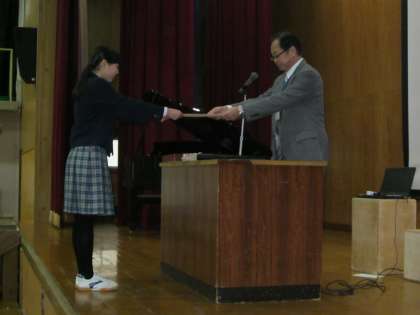 本日,今年最初の全校集会が行われました。はじめに3年生による指揮伴奏で校歌斉唱を行い,その後,伝達表彰が行われました。