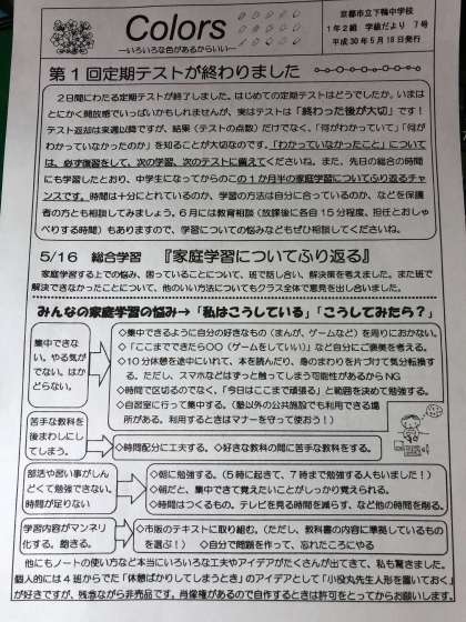 今日は,二つの学級の学級通信を紹介します。この学級通信は,「定期テストは終わった後が大切!」というとても大切な内容になっています。
