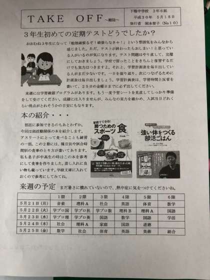今回は2年生の通信は掲載していませんが,2年生は最も三年間の中で,学力も体力も伸びゆく時期です。上記の内容同様に,来る3年生へのステージに向けて復習する機会を増やして下さい。