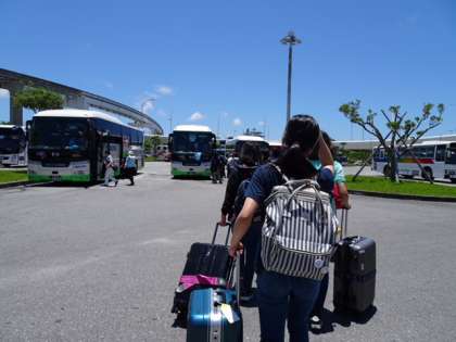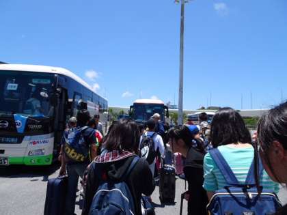 空港からバスに乗り、ひめゆりに向かうところです。きれいな青空が目にまぶしいですね。予想気温は30度を超えるようです。