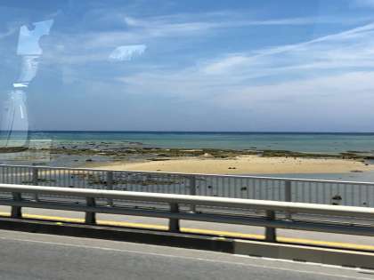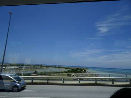 海岸線を走り、ガイドさんの話を聞きながら、ひめゆりの塔に向かっています。