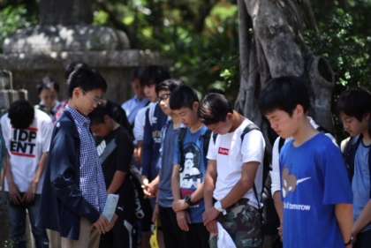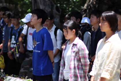 平和セレモニーの様子です。心静かに祈りを捧げています。この後、資料館で戦争の悲惨さ、平和の尊さを学びます。