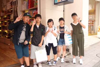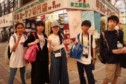 国際通りで班別研修いろいろ。買い物をしています。ブルーシールアイスを食べているところもありますね。