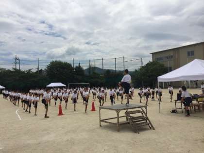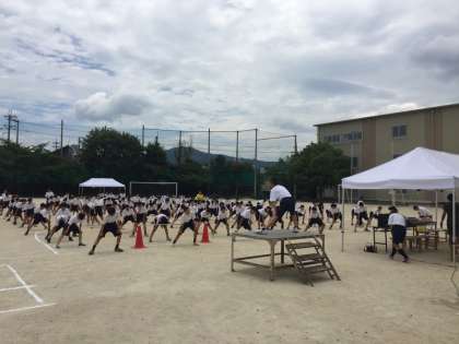 3・4限に1年生が球技大会を実施しています。種目は、サッカーです。男子・女子に分かれて、競技をしています。暑い中での大会です。水分をこまめに取り、体調管理に十分注意をして競技をしております。写真は、開会式の後の、準備体操です。
