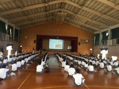 4限に体育館で1年生を対象に服育教育・国際理解教育の一環として、「届けよう、服のチカラ」プロジェクトを実施しました。