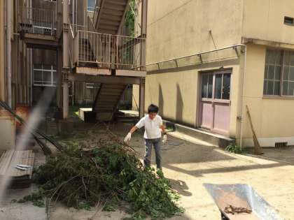 大きな被害をもたらした台風21号が過ぎ去り、校内のあちこちに折れた枝や落ち葉が散乱していました。それを1組の生徒の皆さんが、掃除をしてくれました。校長先生、教頭先生、担任の先生と一緒に中庭の枝葉を掃除してくれました。汗だくになりながらの作業でした。