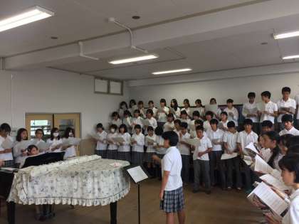 6日(木)から学習発表会と合唱コンクールに向けての取組が始まりました、昼休みには、1組の生徒と1組の発表に有志で参加する生徒との合同練習を行いました。音楽室に入りきらないくらいの生徒が参加し、大きな歌声が廊下まで聞こえていました。コンクール当日の成功は間違いなしです。