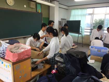 小学生以下の洋服の需要が多いということで,小中連携で実施しています。生徒たちは,たくさん集まった洋服を仕分けしながら,自分たちの小学生時代を思い出しているのか,みんな笑顔で,喜んで作業をしていました。