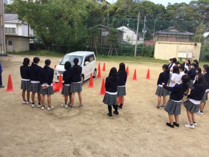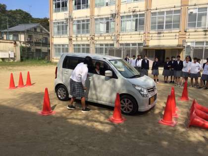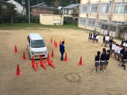 2年生保健の授業「交通事故の発生要因」で,実際に自動車を使って,運転席からの死角について学習しました。運転席に座ってみると,赤いコーンは全く見えないことに気づき,驚くとともに,興味深く授業を受けていました。