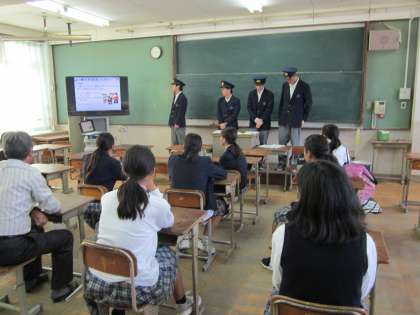 警察関係で体験を行うメンバーは,初日の今日は,少年サポートセンターでお世話になりました。オリエンテーションのあと午前2時間,午後1時間の体験を行った後,下鴨中学校へ戻り,今日学んだ「非行防止教室」の話を参加してくれた生徒に紹介してくれました。