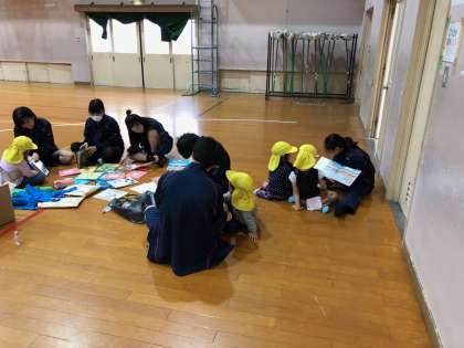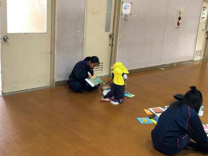 絵本の読み聞かせをしている様子です。園児の皆さんにわかりやすいような読み方ができていました。貴重な体験になったことでしょう。