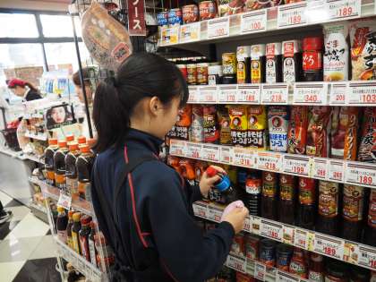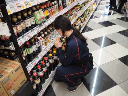 スーパーでの販売活動体験の様子です。商品の陳列ケースの整理をしています。