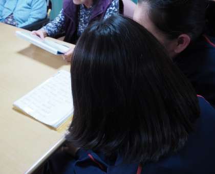 福祉施設での体験です。利用者の皆さんと歌を歌っています。中学生の二人が曲を選んで一緒に歌っていました。利用者の方も喜んでいただけたようです。