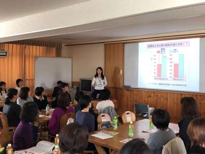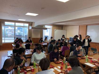 講演のあと,本日の給食を試食していただきました。とても好評で,味や栄養面,金額面でも大満足というご意見が大多数でした。参加者の皆さんも給食とともに会話を楽しんでおられるようでした。先生にも質問される方もたくさんおられ,試食会をきっかけに給食に関心をもっていただけたのではないかなと思います。
