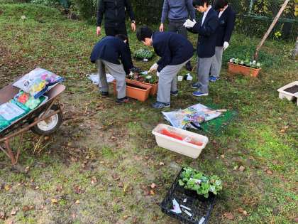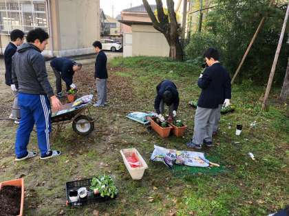 1組の生徒の皆さんが,作業の時間に花の植え替え作業をしてくれました。プランターに小石を敷き,その上に土を入れ,苗を一つ一つ丁寧に植えていきました。とても,楽しそうに作業をしている姿が印象的でした。