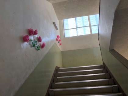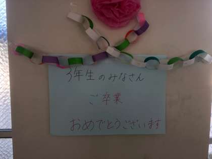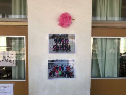 校舎も花や写真で彩られています。