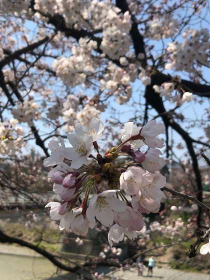 京都の桜はほぼ満開となっています。私達の学校の近くの高野川の桜もほどよい淡いピンクと白のコントラスト麗しく,川の流れをより美しく魅せてくれています。