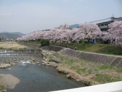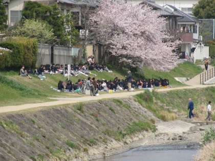 中学校のすぐそばを流れる高野川に、美しい桜が一面に咲きました。全生徒がお弁当や給食、パンを持って、桜の花のもとで、ゆっくりと昼食を食べました。1年生がきちんと並んで食べていたのに対して、2・3年生はあっという間に食べ終わり、桜の花吹雪を楽しむかのように歩き回っていたのが印象的でした。昨年は少し肌寒かったのですが、今年は暖かくて本当にのんびりできました。
