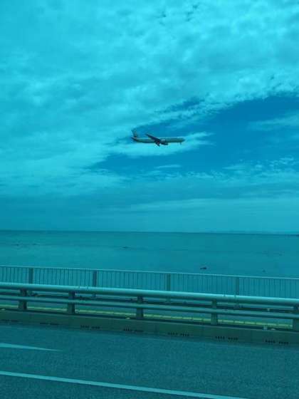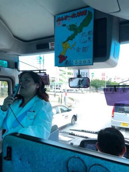 那覇空港からバスに分乗し,ひめゆりの塔に向かいます。ガイドさんの話に耳を傾けながら,30分ほどの道のりを移動しています。