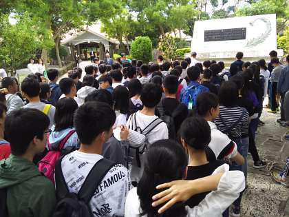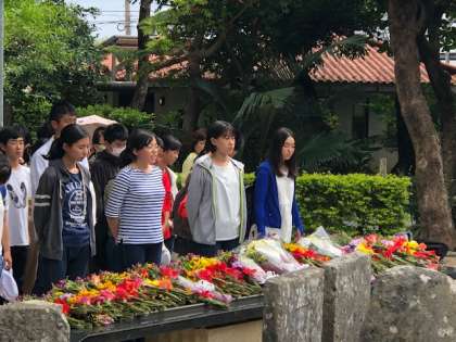 平和祈念セレモニーの様子です。事前学習で平和への祈りや願いをまとめた「平和の誓い」を生徒代表が朗読し,その後,全員で黙とうを捧げました。この後,ひめゆり平和祈念資料館の見学,ガマ体験へ向かいます。