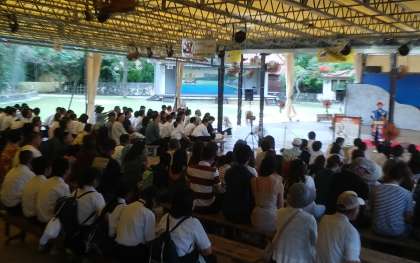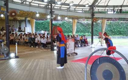 おきなわワールドでスーパーエーサーを鑑賞しているとこです。沖縄の伝統に触れるとてもいい機会になっているようです。