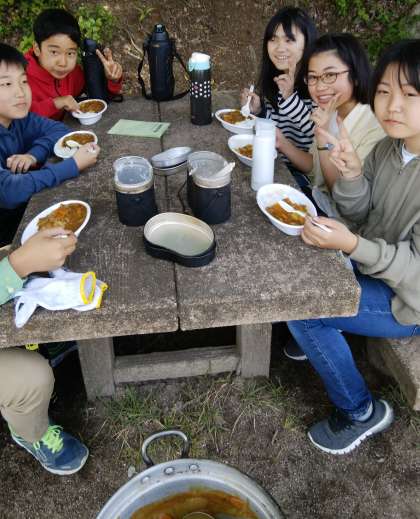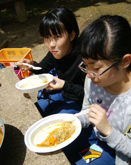 カレーが出来上がり,おいしそうに食べています。笑顔も素敵です。星型のニンジンかわいいですね。