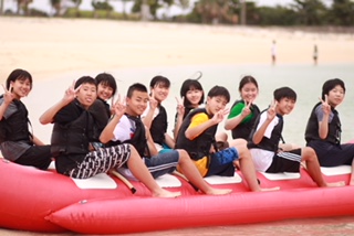 民家の方との記念撮影とバナナボートです。ほんとにみんな笑顔で,楽しいそうです。充実した時間を過ごしているようです。