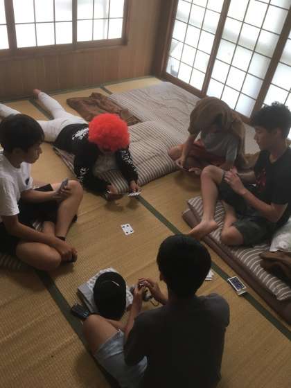 民家の方との交流です。畳の上で,くつろぐ姿は,自分の家のようですね。様々な活動で疲れた体を休めることのできるのは,ホテルよりも民家さんの方なのかもしれませんね。